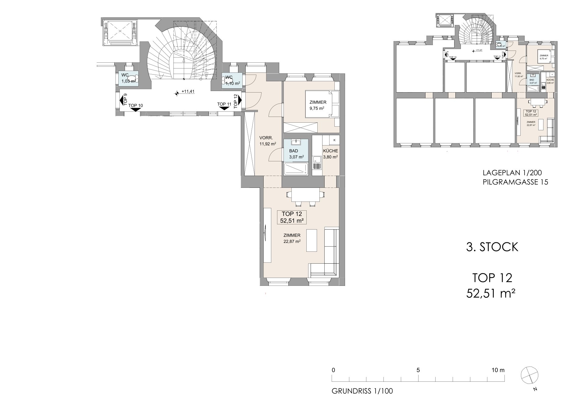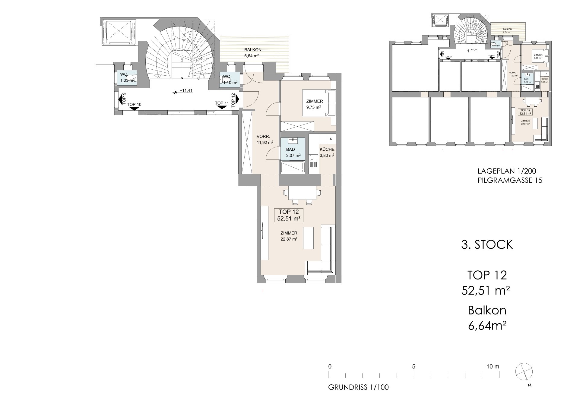 Diese charmante 2-Zimmer-Wohnung im 3. Stock bietet auf rund 52,5 m² eine ideale Raumaufteilung für Singles oder Paare. Über den großzügigen Vorraum gelangt man in ein helles Wohnzimmer mit fast 23 m², das viel Platz für Wohnen und Essen bietet. Ein separates Schlafzimmer, eine kompakte Küche sowie ein Badezimmer mit WC runden das Angebot ab.