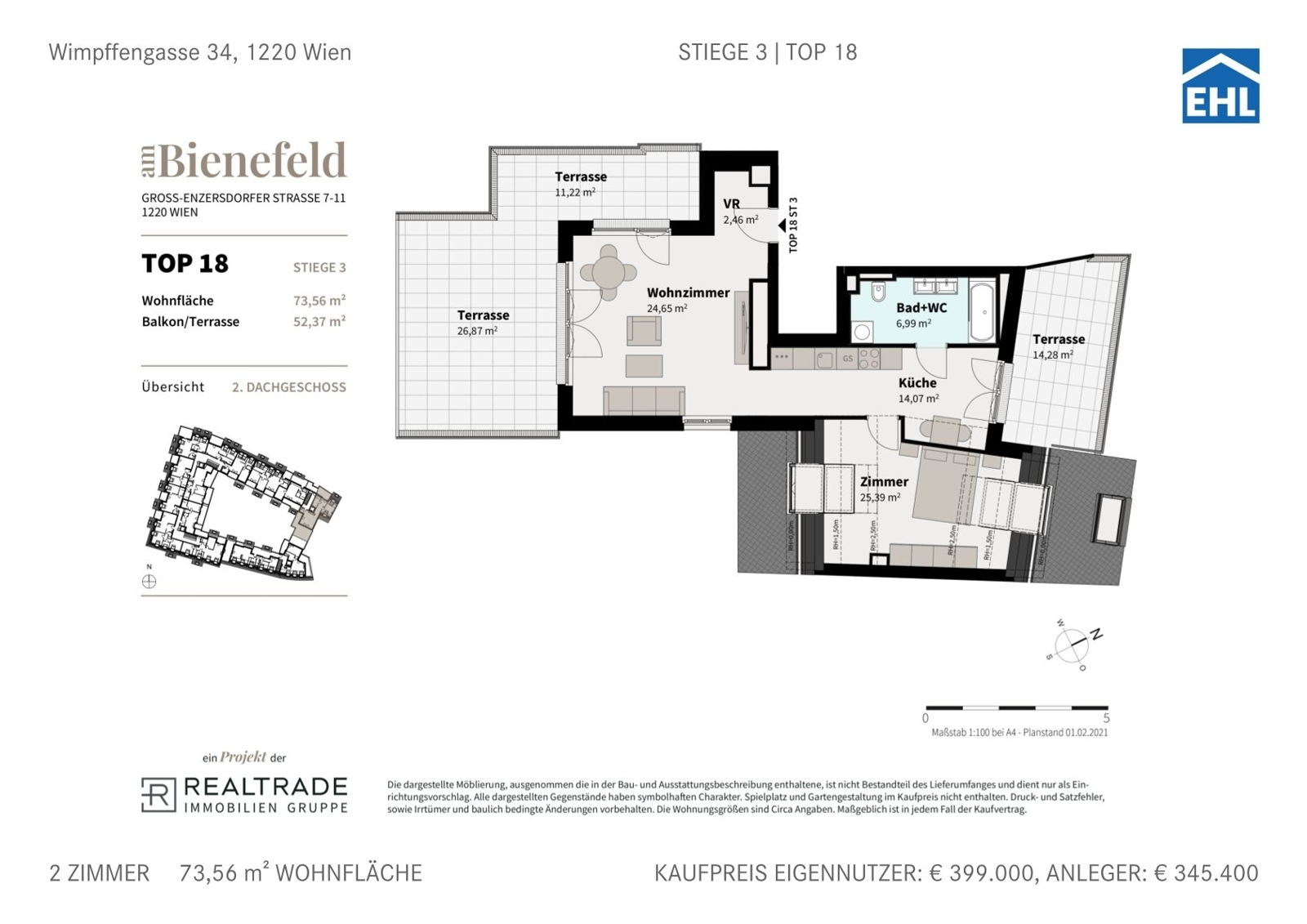 Willkommen am Bienefeld – in der Groß-Enzersdorfer Straße 7–11 im 22. Wiener Gemeindebezirk entsteht eine moderne Wohnhausanlage mit 83 bereits bezugsfertigen Eigentumswohnungen. Jede Einheit überzeugt durch großzügige Freiflächen wie Balkone, Terrassen oder Eigengärten, die zum Verweilen im Freien einladen. Die klar strukturierte, zeitlose Architektur fügt sich harmonisch in die Umgebung ein und vermittelt gemeinsam mit der Auswahl hochwertiger, natürlicher Materialien ein Gefühl von Ruhe und Geborgenheit.