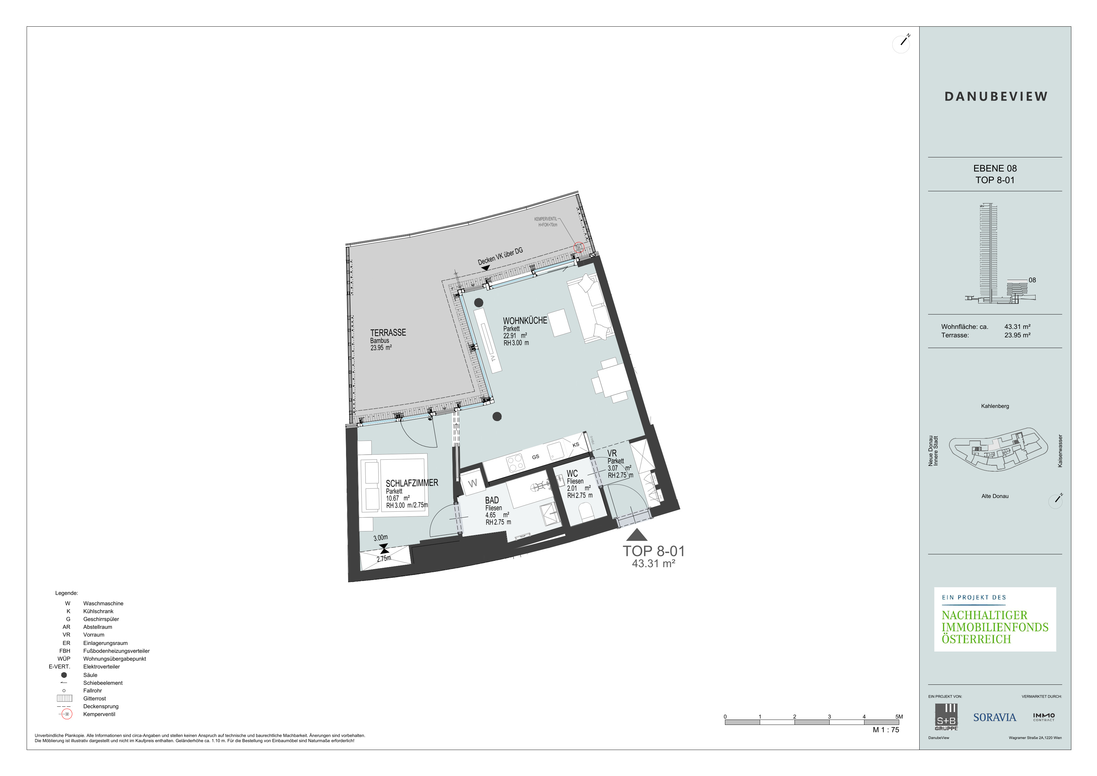 DANUBEVIEW umfasst insgesamt 159 Mietwohnungen mit Größen zwischen 30 m² und 150 m², verteilt auf 1 bis 4 Zimmer. Großzügige Grundrisse und lichtdurchflutete Räume mit weitläufigen Fensterfronten eröffnen atemberaubende Ausblicke auf die Donau und die City.