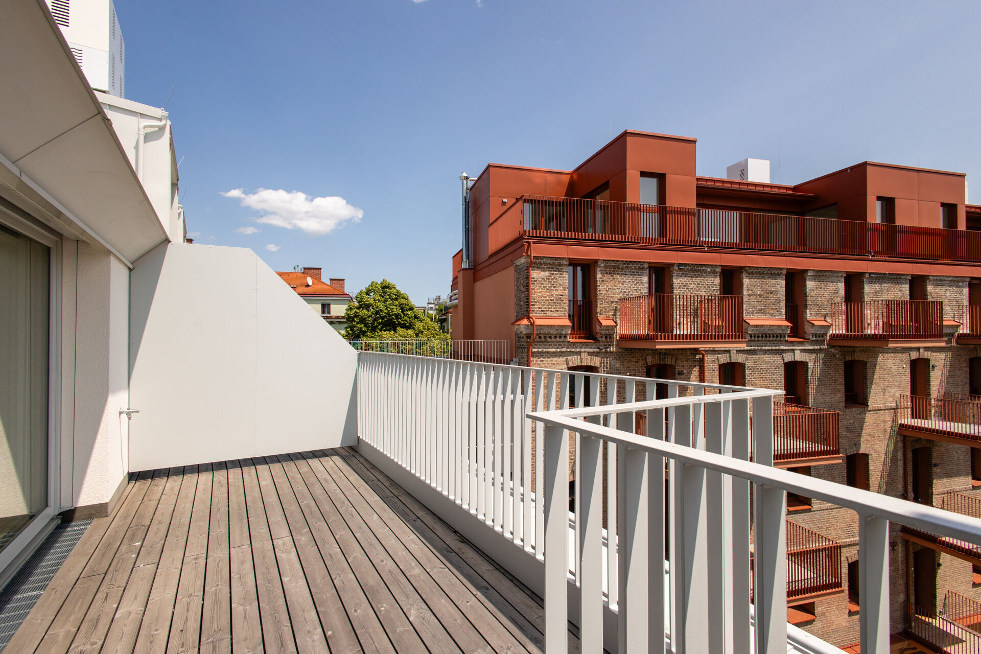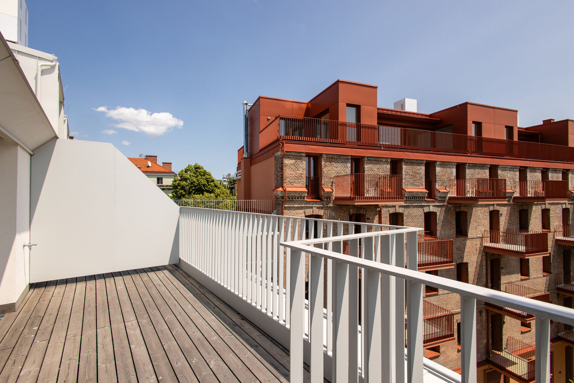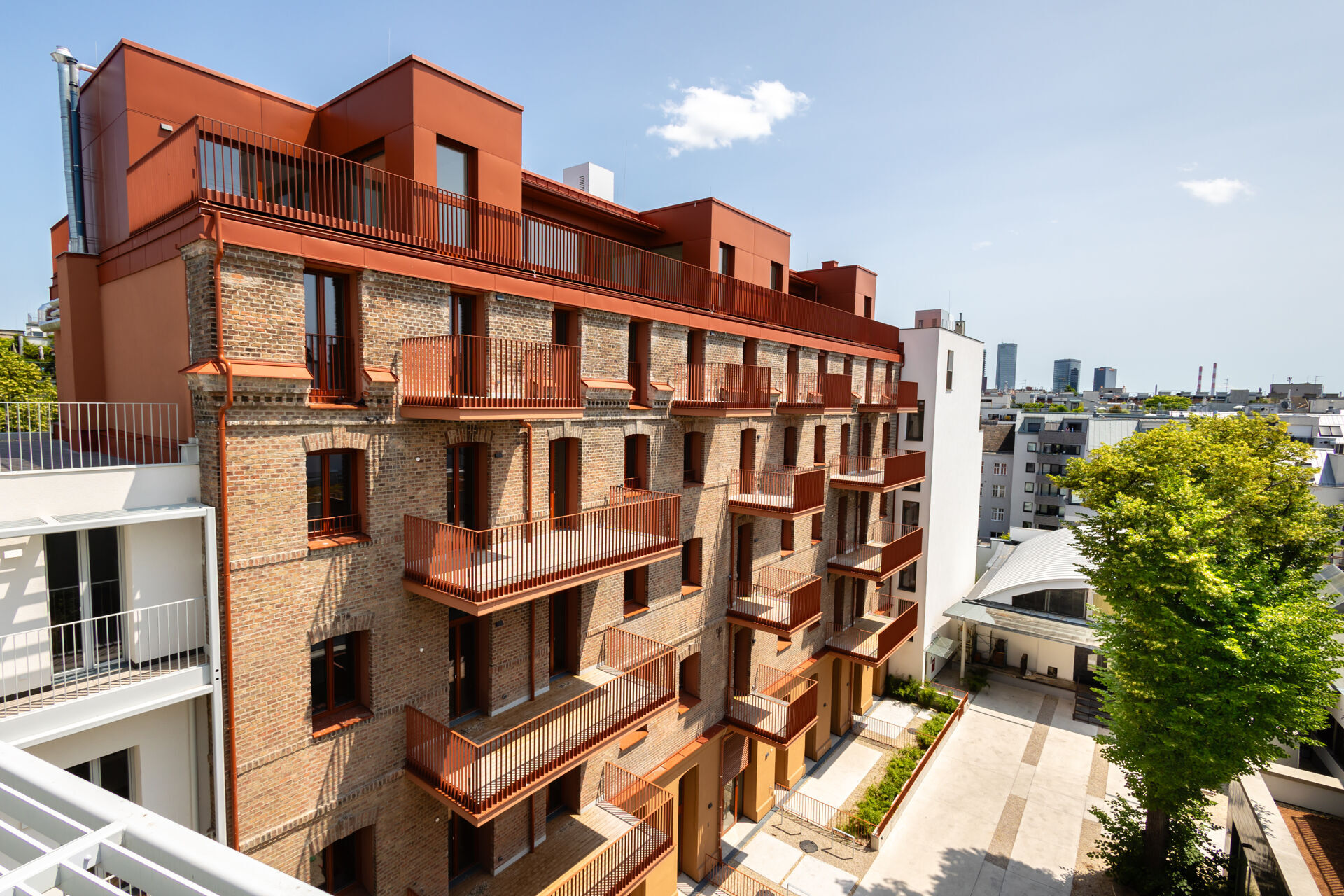 Die Liegenschaft gliedert sich in vier architektonisch unterschiedliche Gebäudetrakte: den sorgfältig revitalisierten Altbestand mit Straßentrakt und zwei Stiegen, einen charmanten Hoftrakt mit klassischer Backsteinfassade sowie einen modernen Neubautrakt im Innenhof. Diese Vielfalt schafft ein hohes Maß an Individualität und architektonischem Reiz.