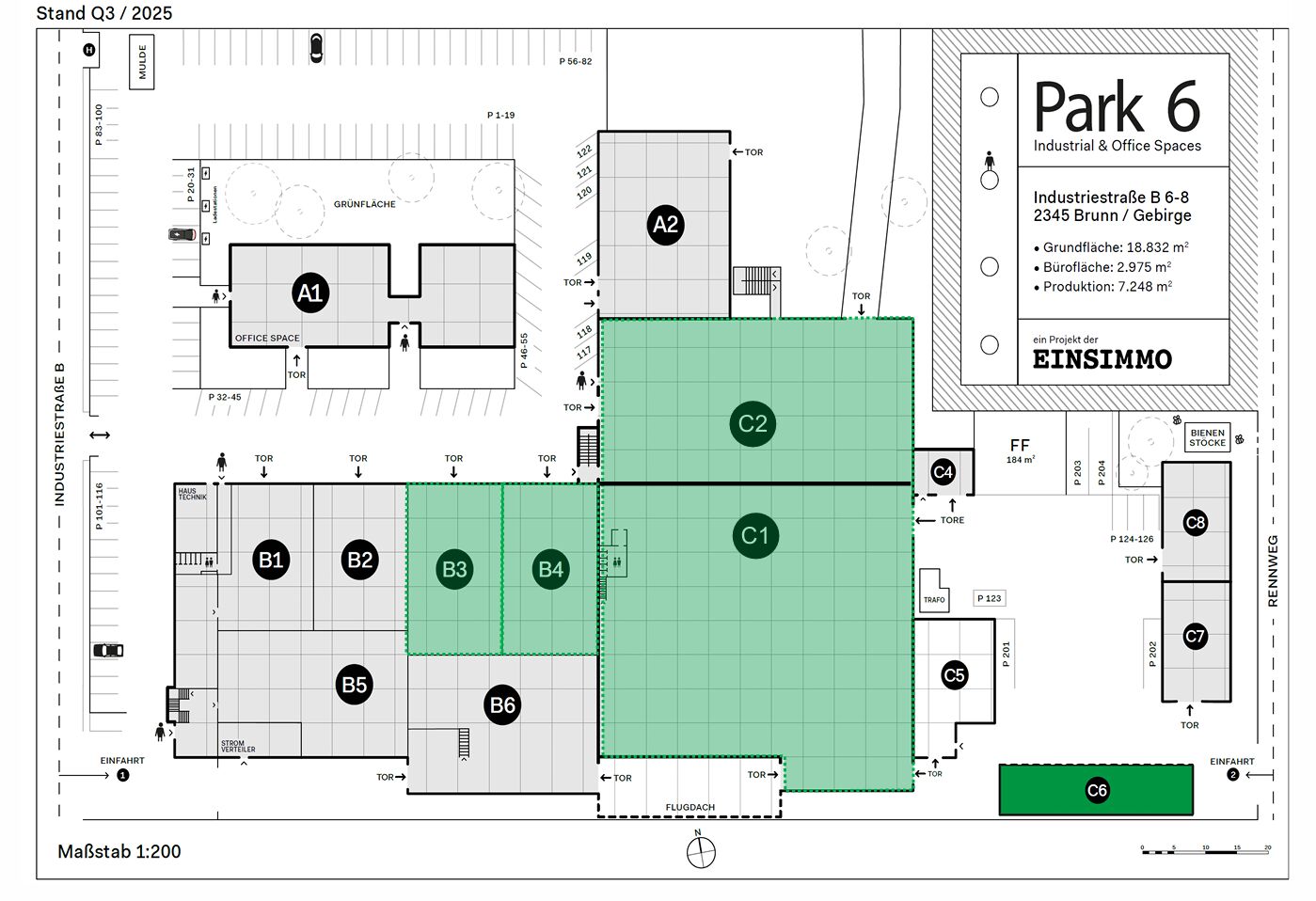 Der Gewerbepark „Park6“ in 2345 Brunn am Gebirge bietet auf einer Gesamtfläche von rund 18.000 m² moderne und vielseitig nutzbare Gewerbeflächen. Zur Vermietung stehen separat anmietbare Einheiten, bestehend aus Lagerflächen von ca.365m² - 3.524m² sowie Büroflächen von ca.130m² – 1.095m². Die Flächenaufteilung ermöglicht eine flexible Nutzung und bietet Lösungen für vielseitige Anforderungen. Die Hallen sind ebenerdig zugänglich und verfügen jeweils über Einfahrtstore für eine komfortable Andienung.