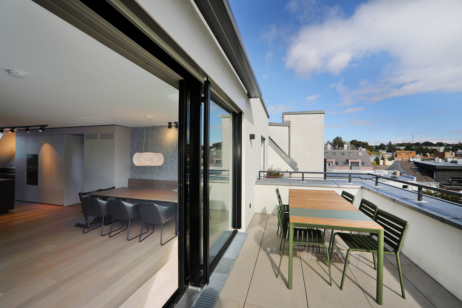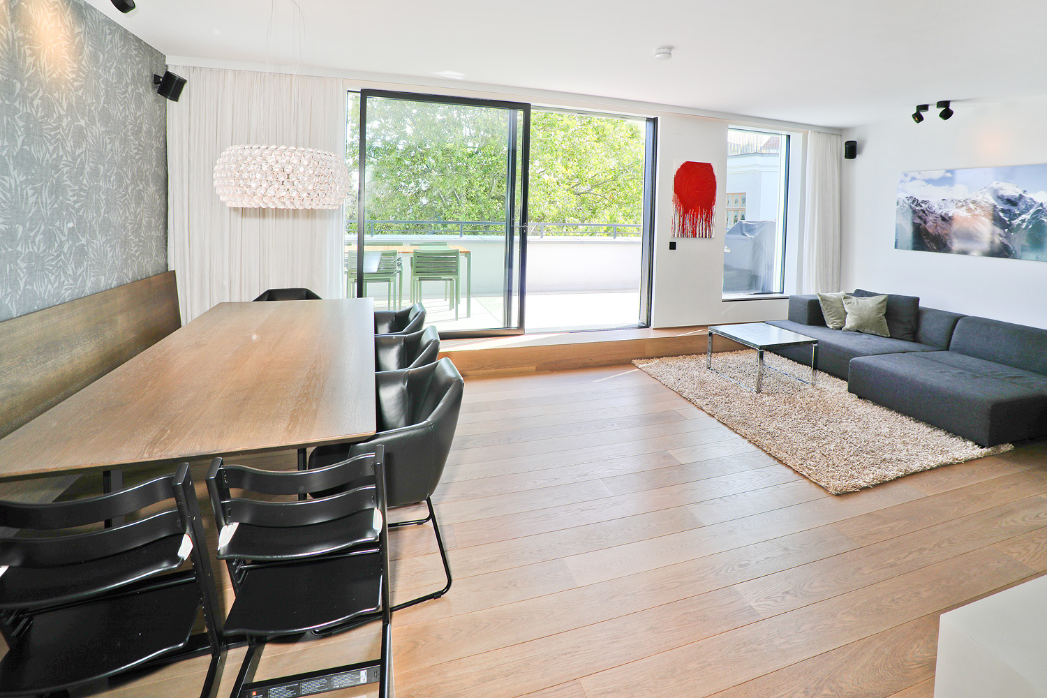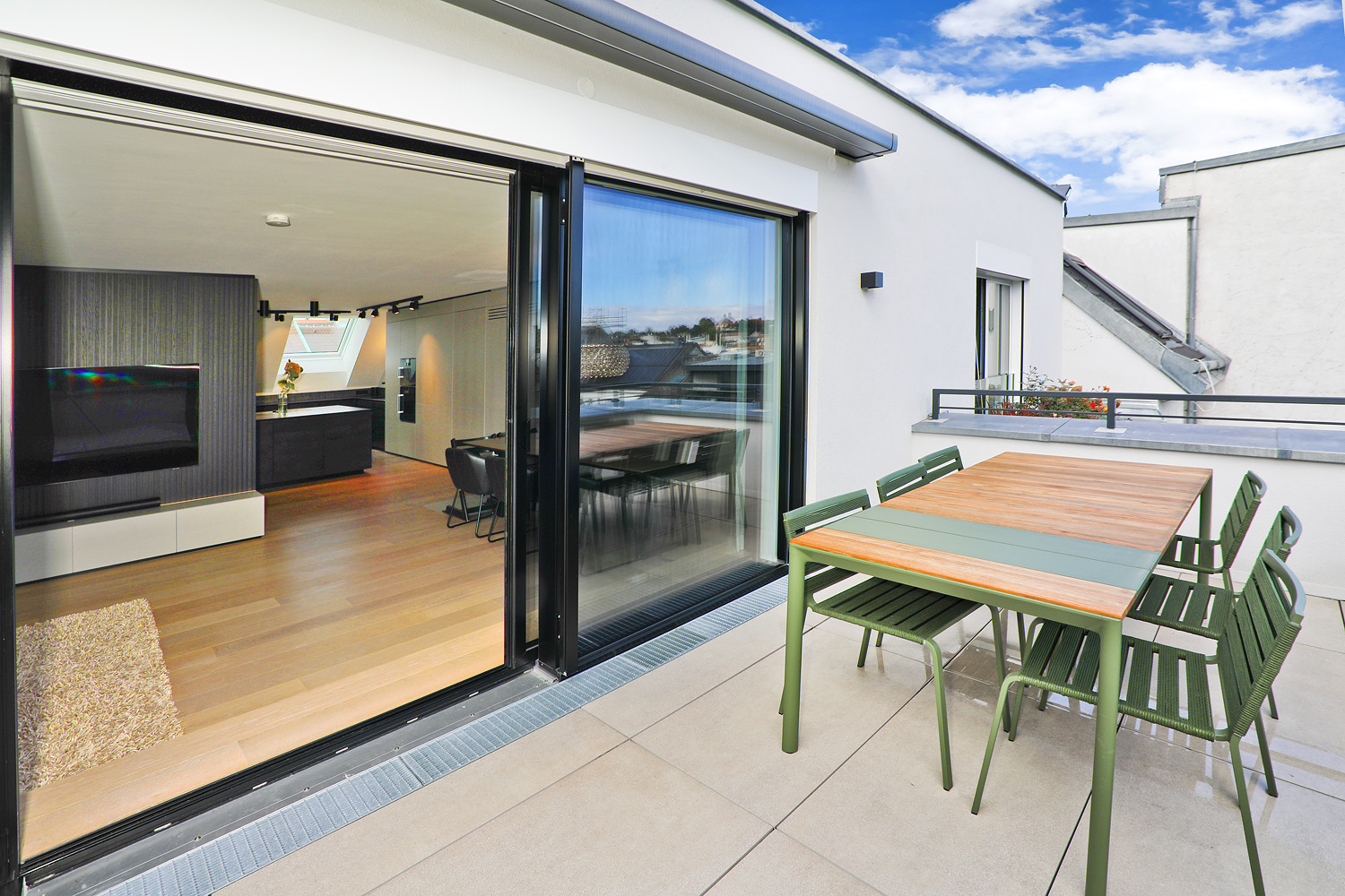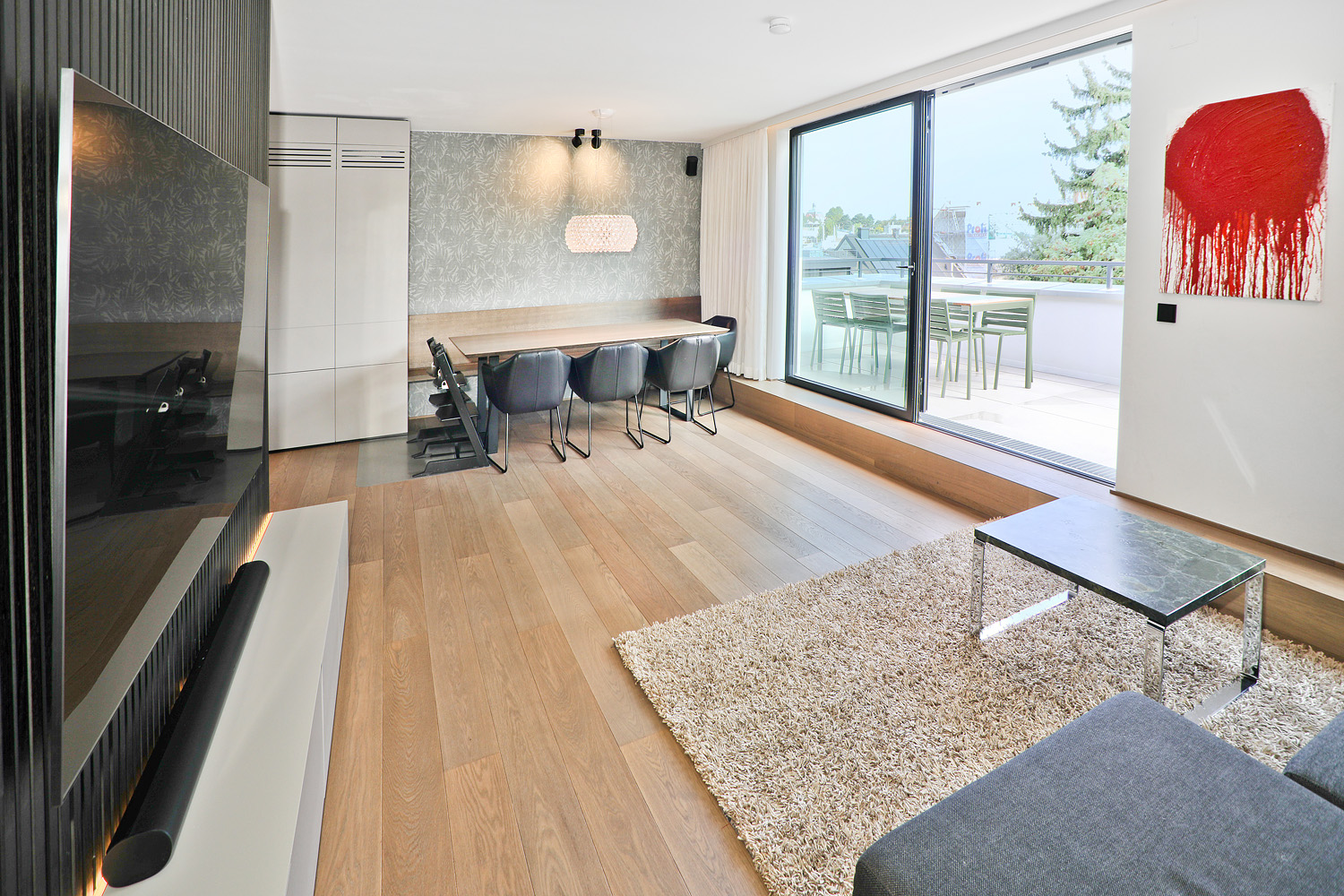 Der großzügige Wohnbereich bildet das Herzstück der Wohnung und verbindet sich nahtlos mit der maßgefertigten Designküche, ausgestattet mit Gaggenau- und Miele-Geräten sowie einer tiefschwarzen Granit-Arbeitsplatte Nero Assoluto. Von hier aus gelangt man direkt auf die rund 20 m² große Terrasse mit offenem Weitblick.