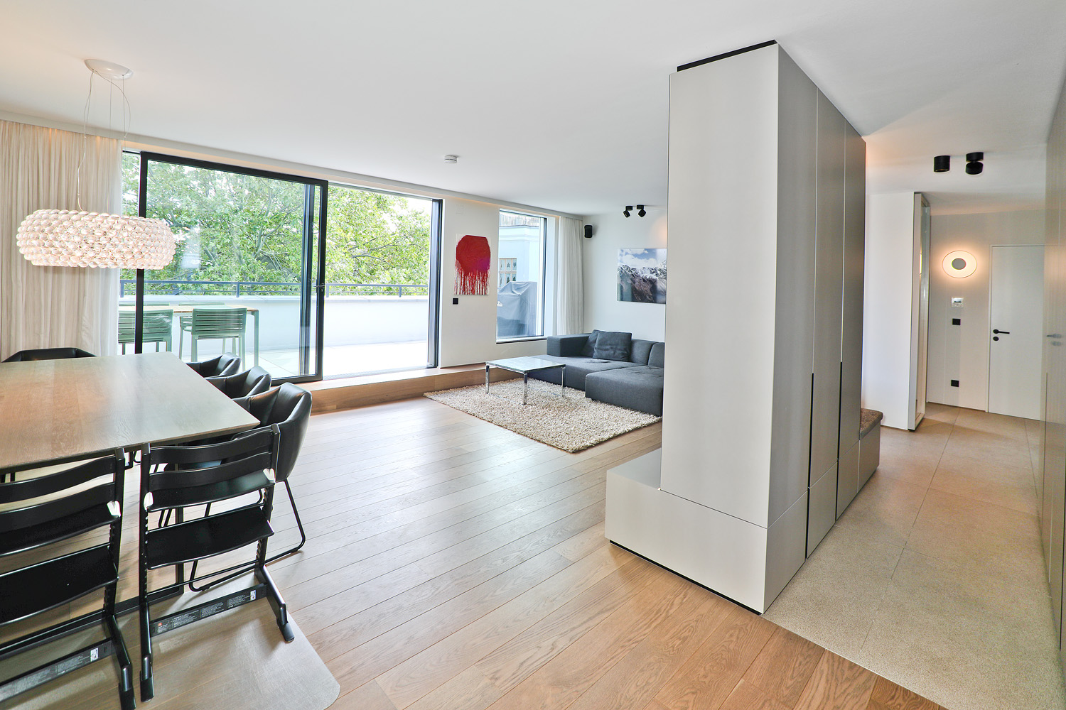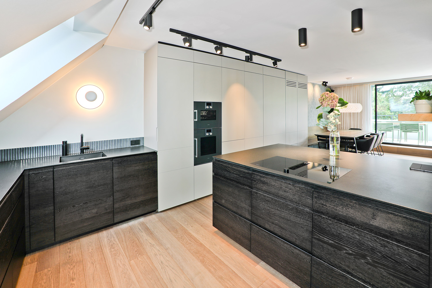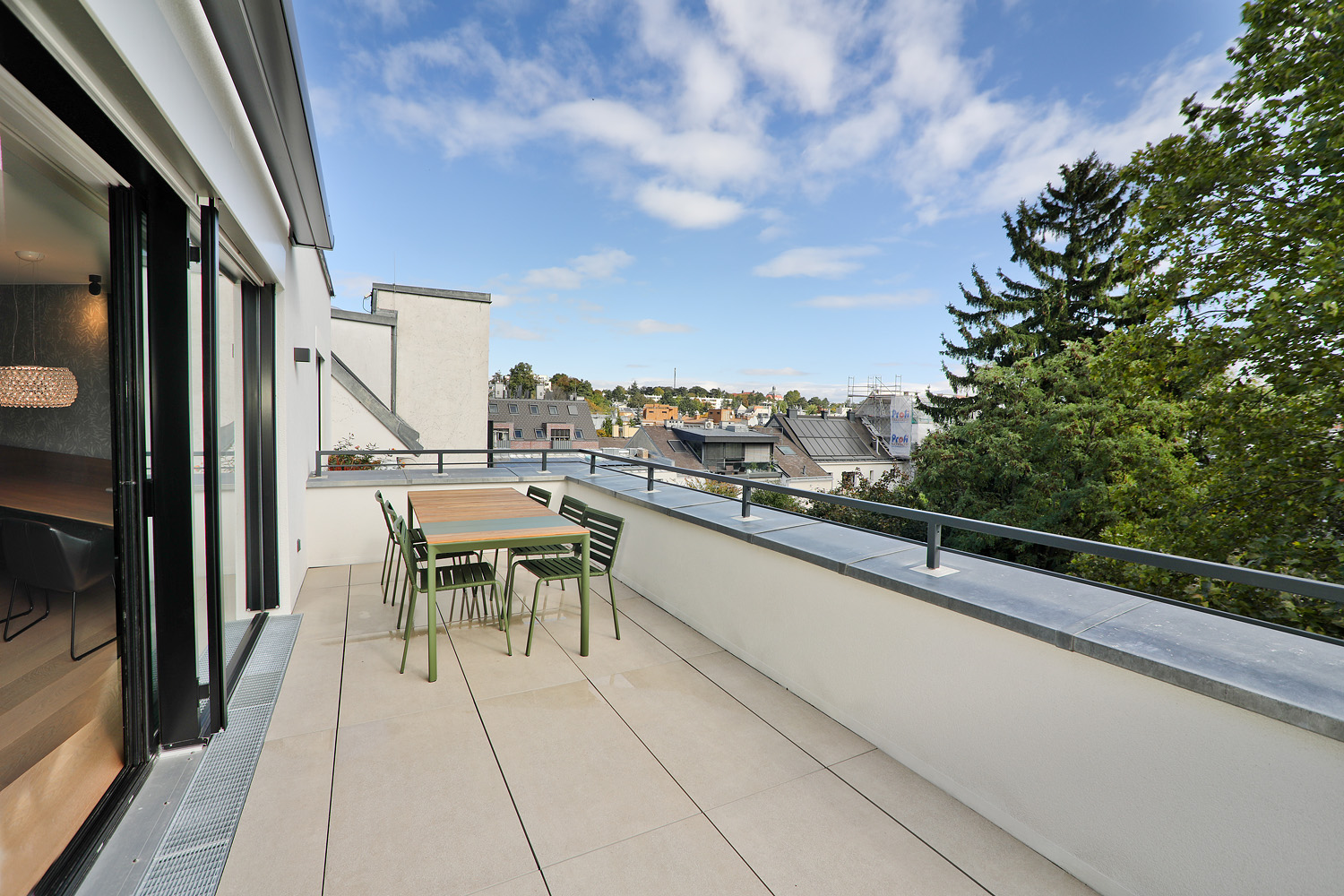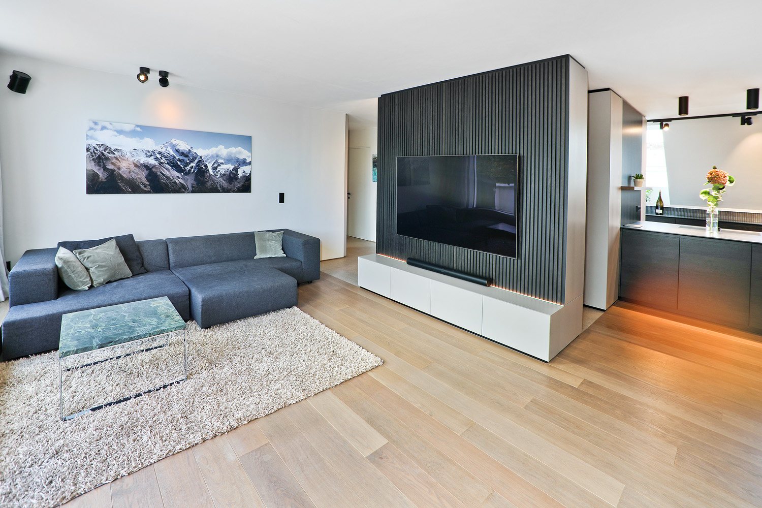 Der großzügige Wohnbereich bildet das Herzstück der Wohnung und verbindet sich nahtlos mit der maßgefertigten Designküche, ausgestattet mit Gaggenau- und Miele-Geräten sowie einer tiefschwarzen Granit-Arbeitsplatte Nero Assoluto. Von hier aus gelangt man direkt auf die rund 20 m² große Terrasse mit offenem Weitblick.