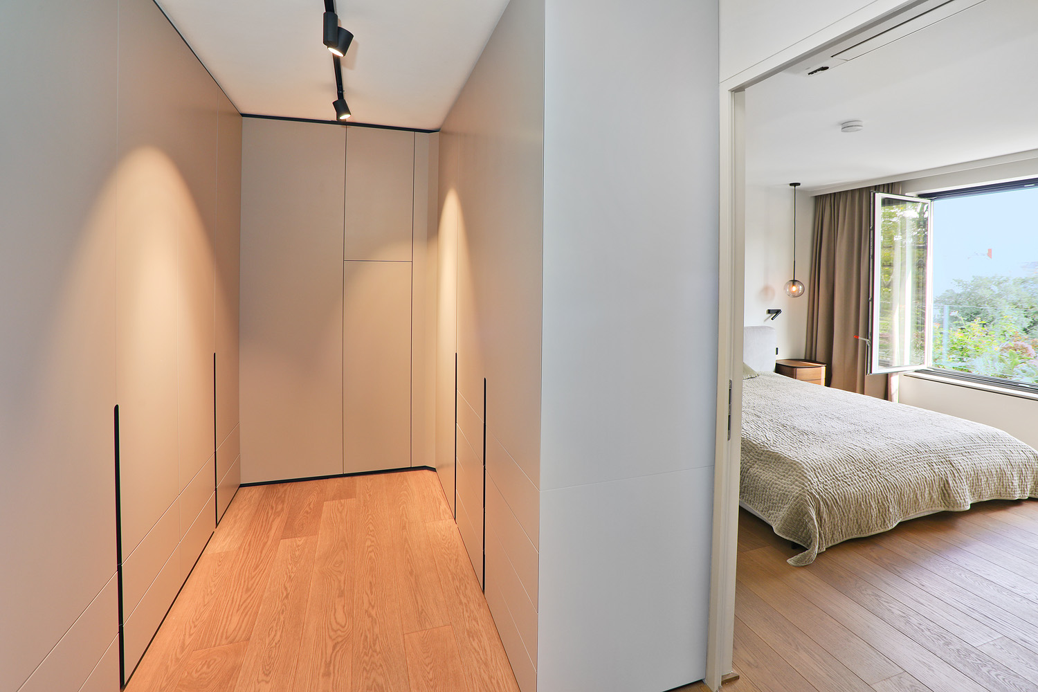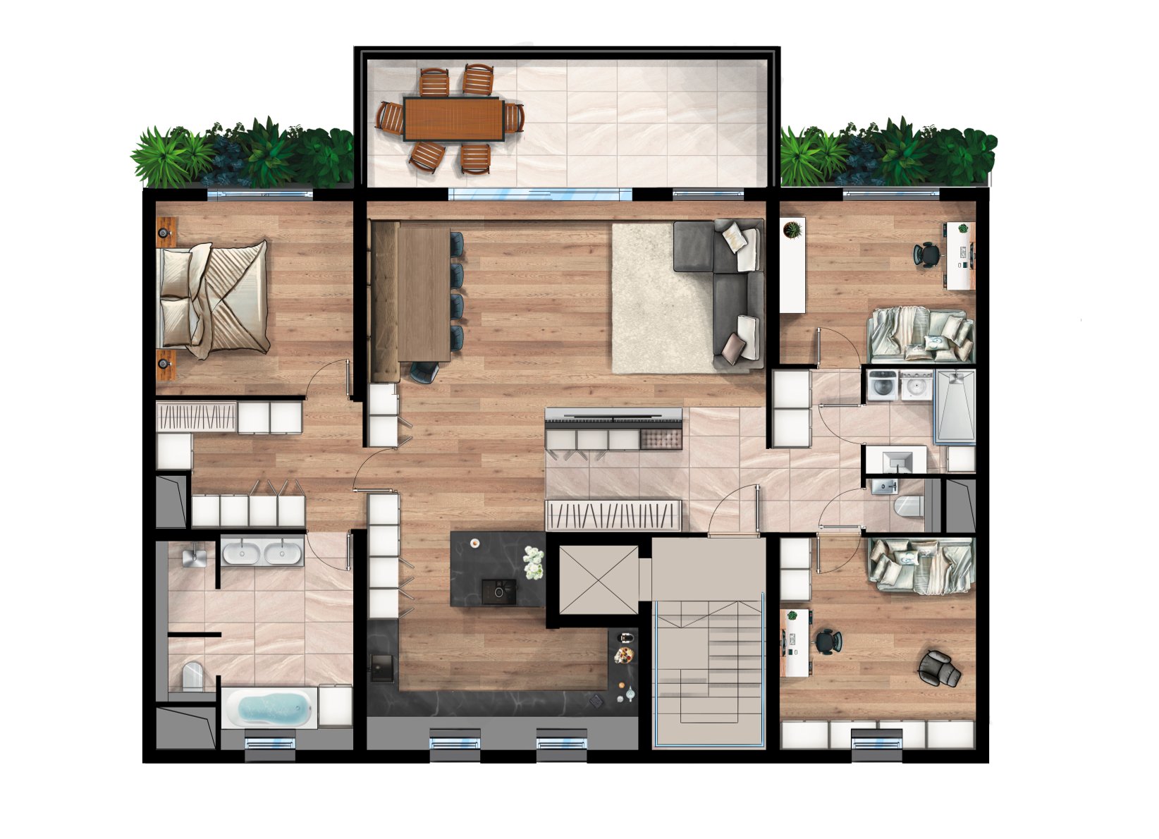 Der Elternbereich ist über eine dezent integrierte Pivot-Türe zugänglich und umfasst einen Schrankraum, ein Schlafzimmer sowie ein exklusiv ausgestattetes Badezimmer mit begehbarer Dusche und Badewanne. Auf der gegenüberliegenden Seite der Wohnung befinden sich zwei weitere Zimmer, ein Gäste-WC sowie ein zweites Badezimmer, wodurch eine klare und gut nutzbare Zonierung entsteht.