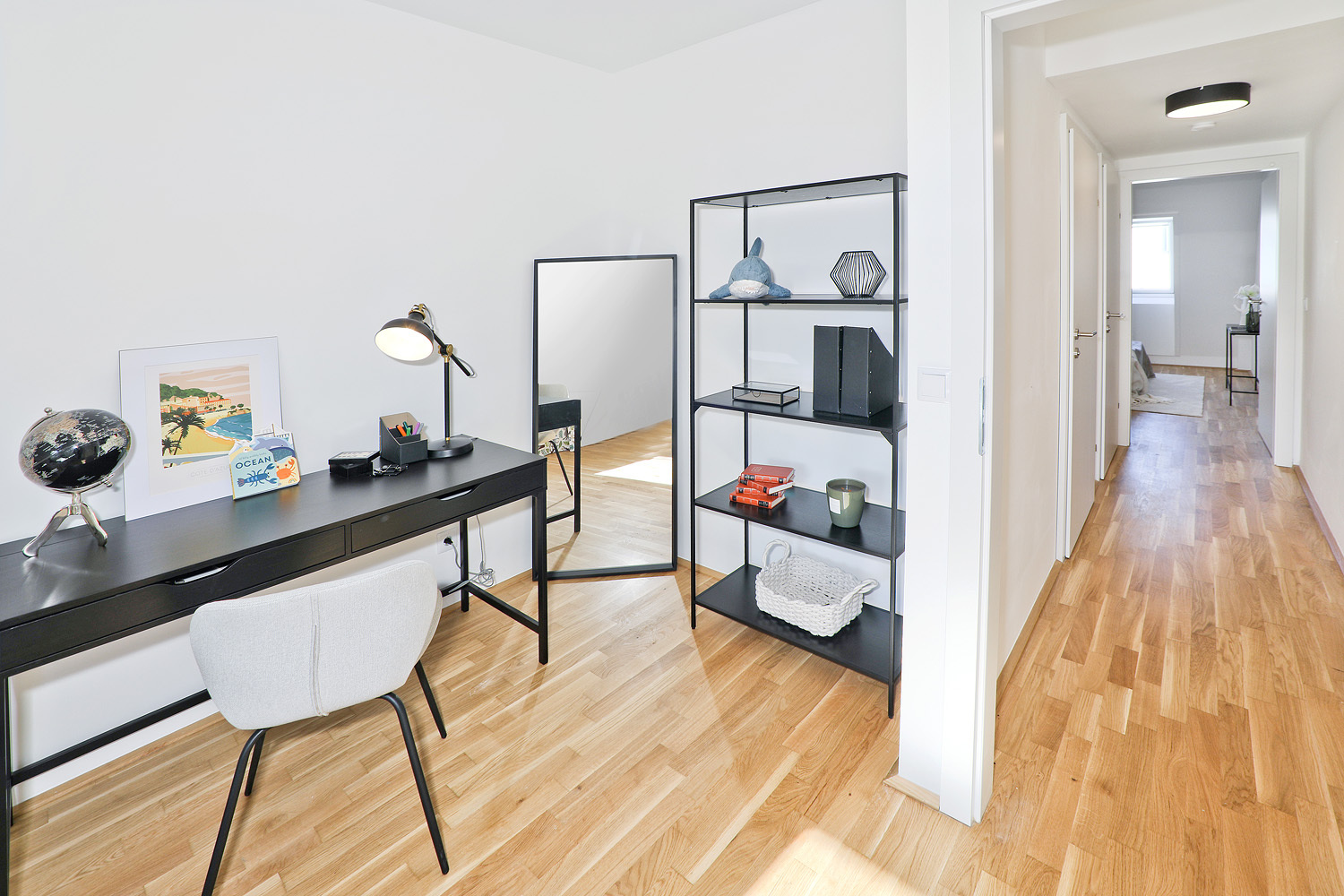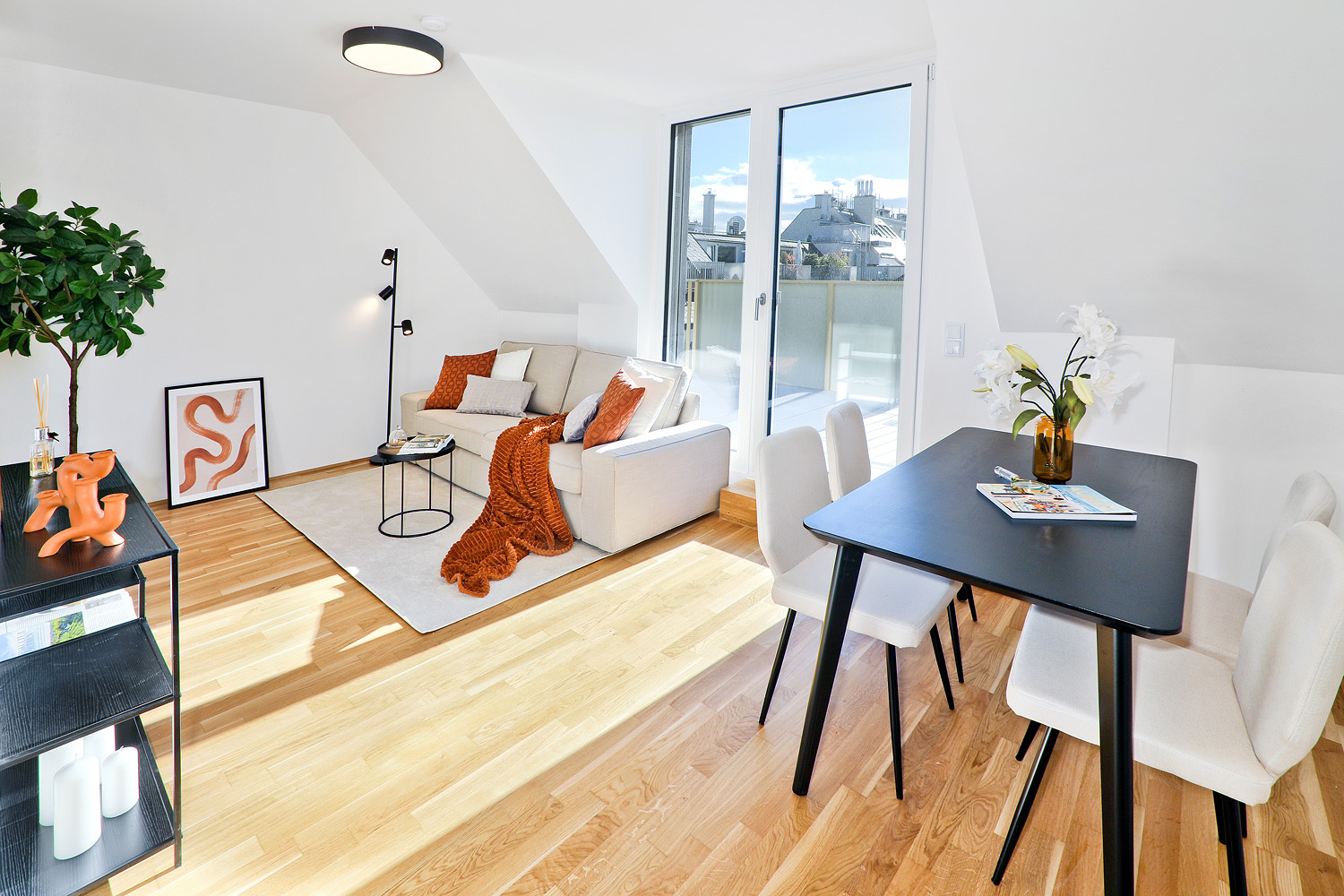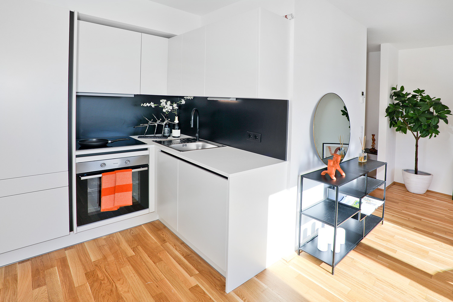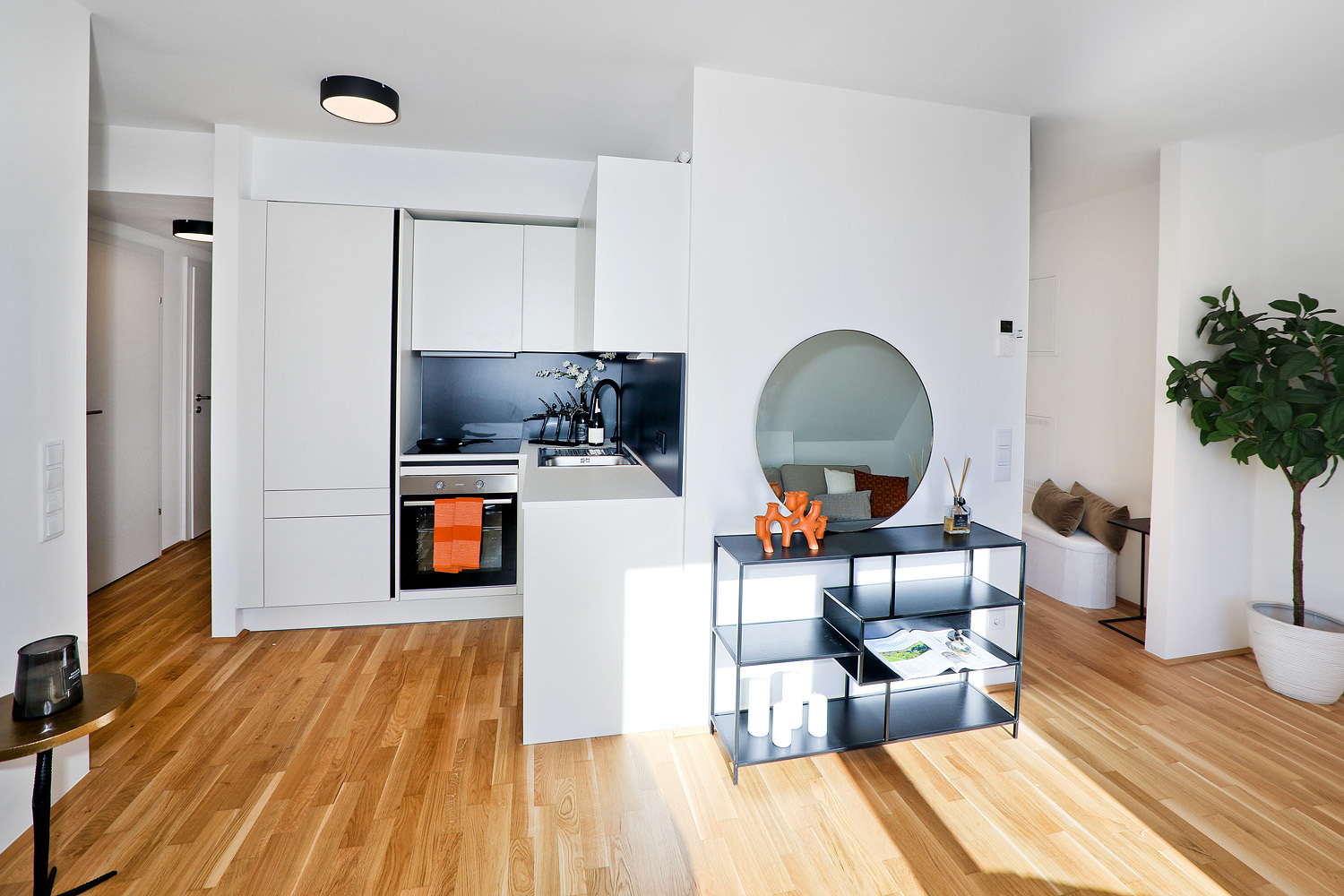 Die Wohnungen verfügen über große, bodentiefe Fenster, die viel natürliches Licht hereinlassen und für eine angenehme Wohnatmosphäre sorgen. Hochwertige Materialien wie Parkettböden in den Wohnbereichen und moderne Fliesen in den Badezimmern unterstreichen den gehobenen Anspruch des Objekts. Je nach Stockwerk bieten die Wohnungen eine wunderbare Aussicht auf die grüne Umgebung oder die beeindruckende Skyline der Donau City.