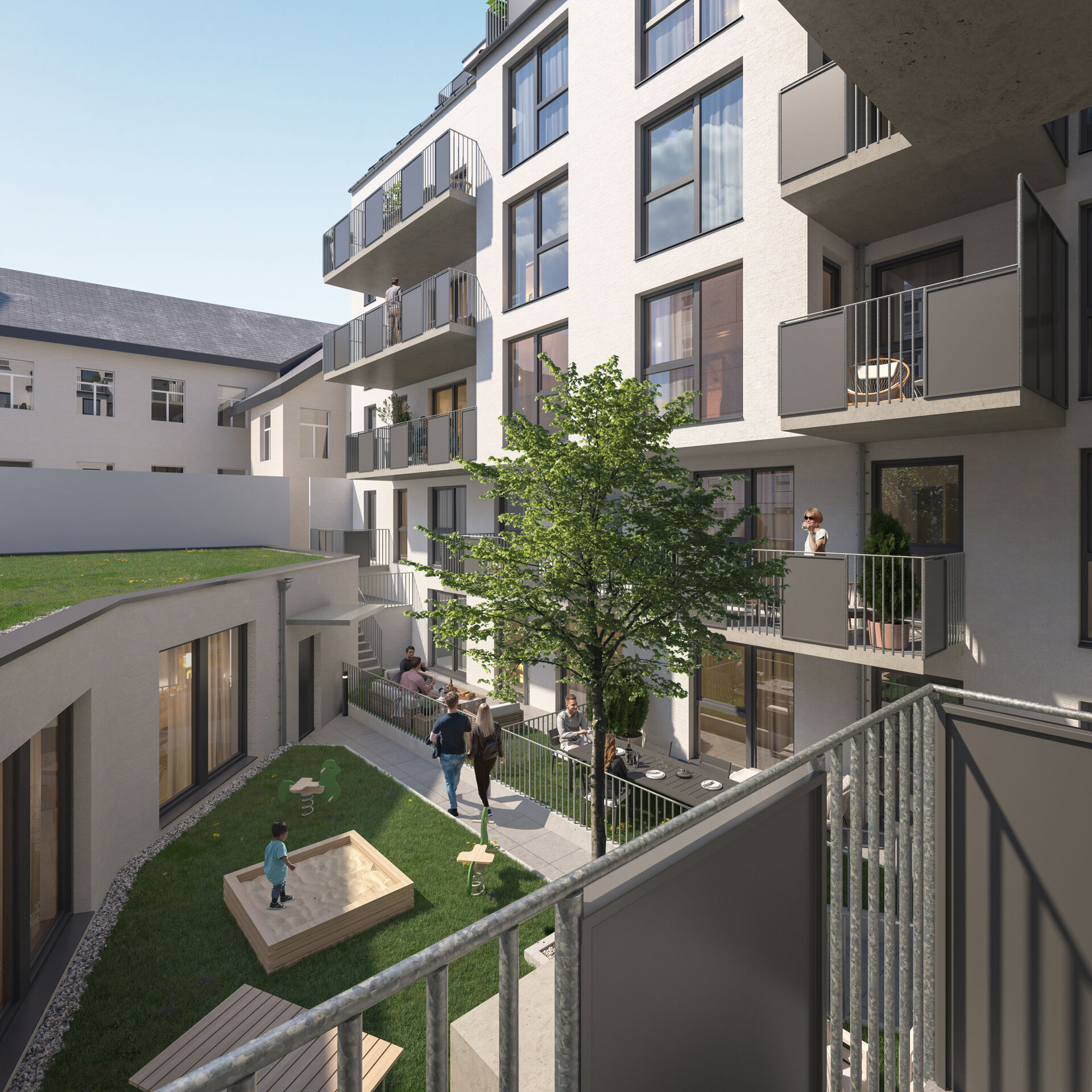 Die Beheizung und Kühlung erfolgen über ein nachhaltiges Energiekonzept mit Wärmepumpe, Erdwärmesonden und Bauteilaktivierung. Begrünte Innenhofbereiche, Fassaden- und Dachflächen schaffen ein angenehmes Mikroklima und erhöhen die Aufenthaltsqualität.