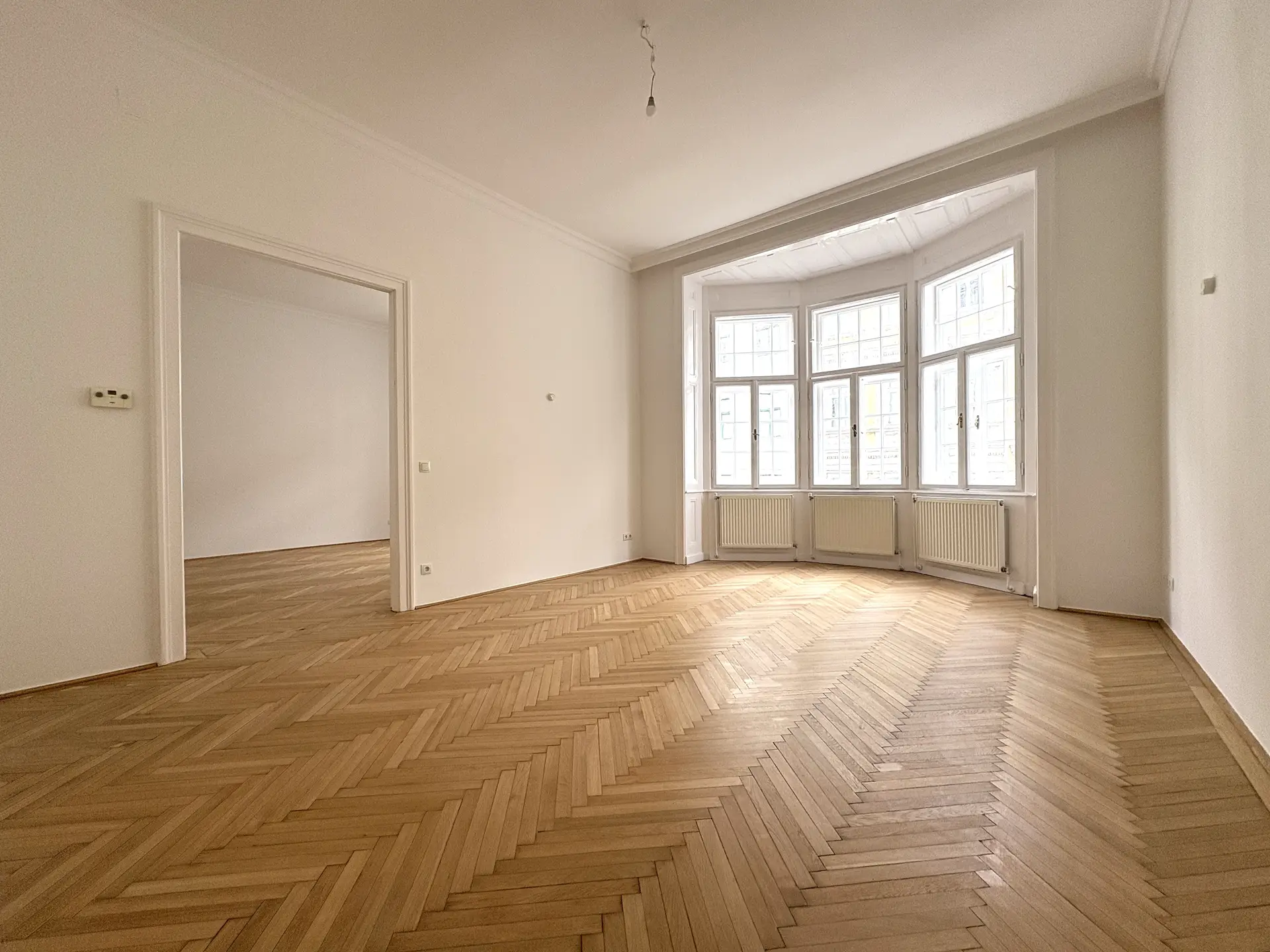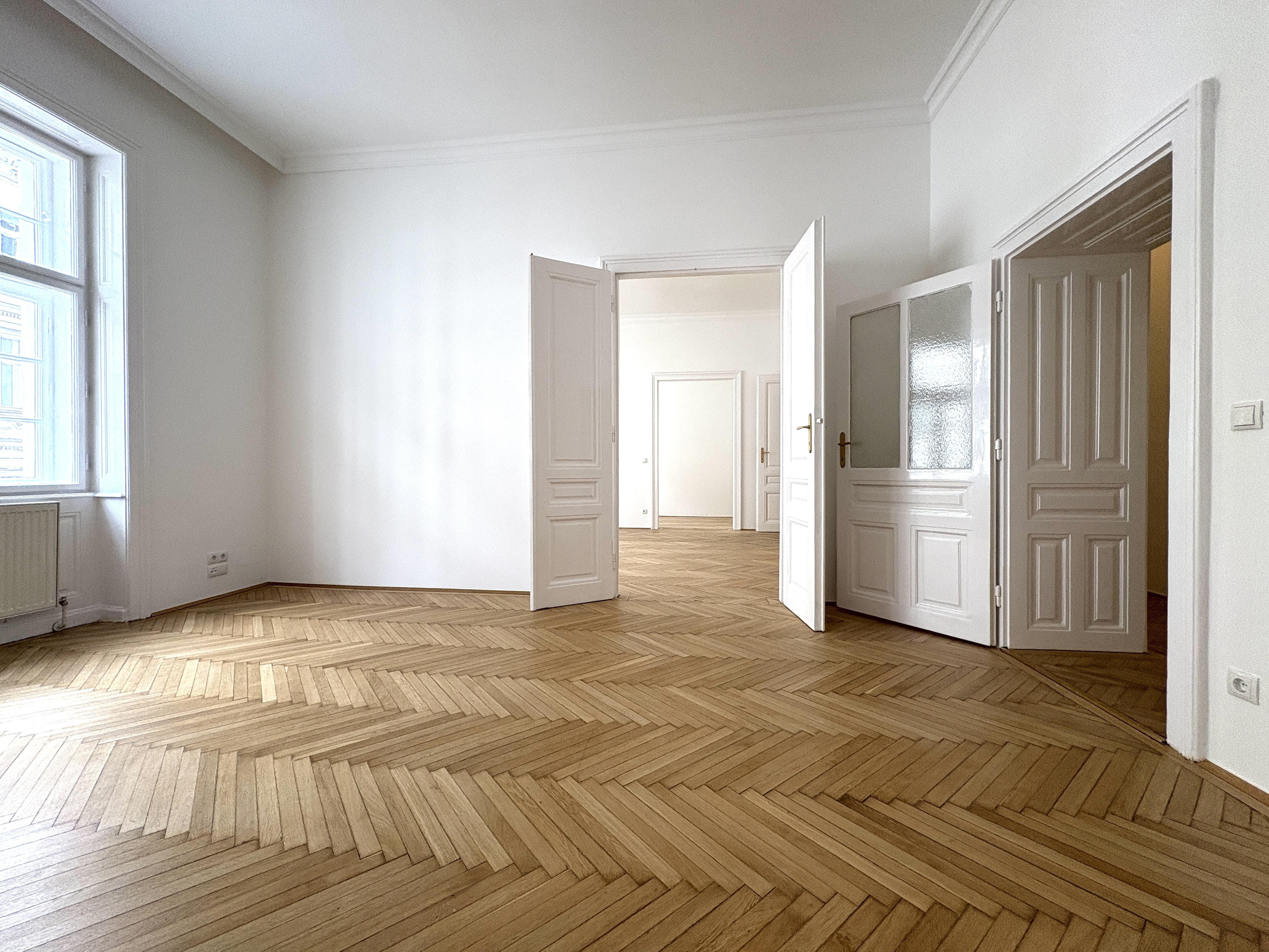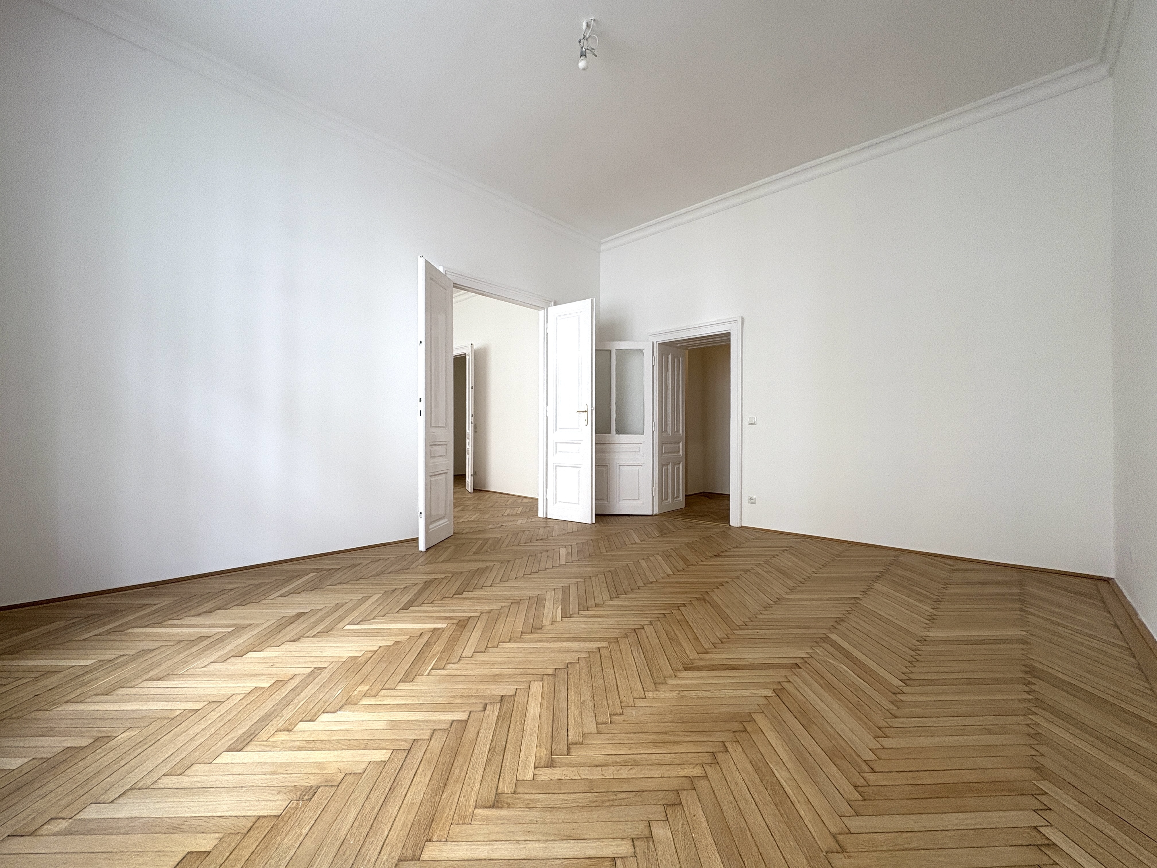 Top 13 ist eine klassische Wiener Altbauwohnung mit einer selten gut funktionierenden Aufteilung. Auf 103,80 m² Wohnfläche verteilen sich vier separat begehbare Zimmer, ein großzügiger Wohnraum, eine eigene Küche, Bad und separates WC sowie ein zentraler Vorraum, der die Wohnung sauber erschließt.