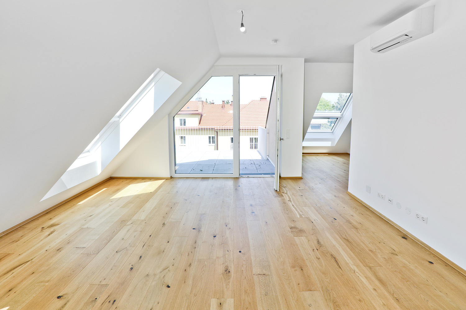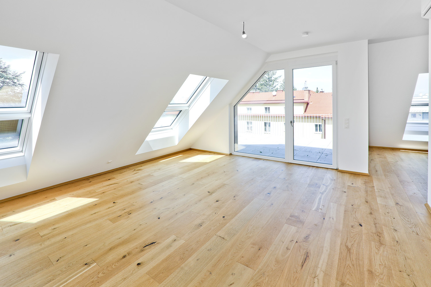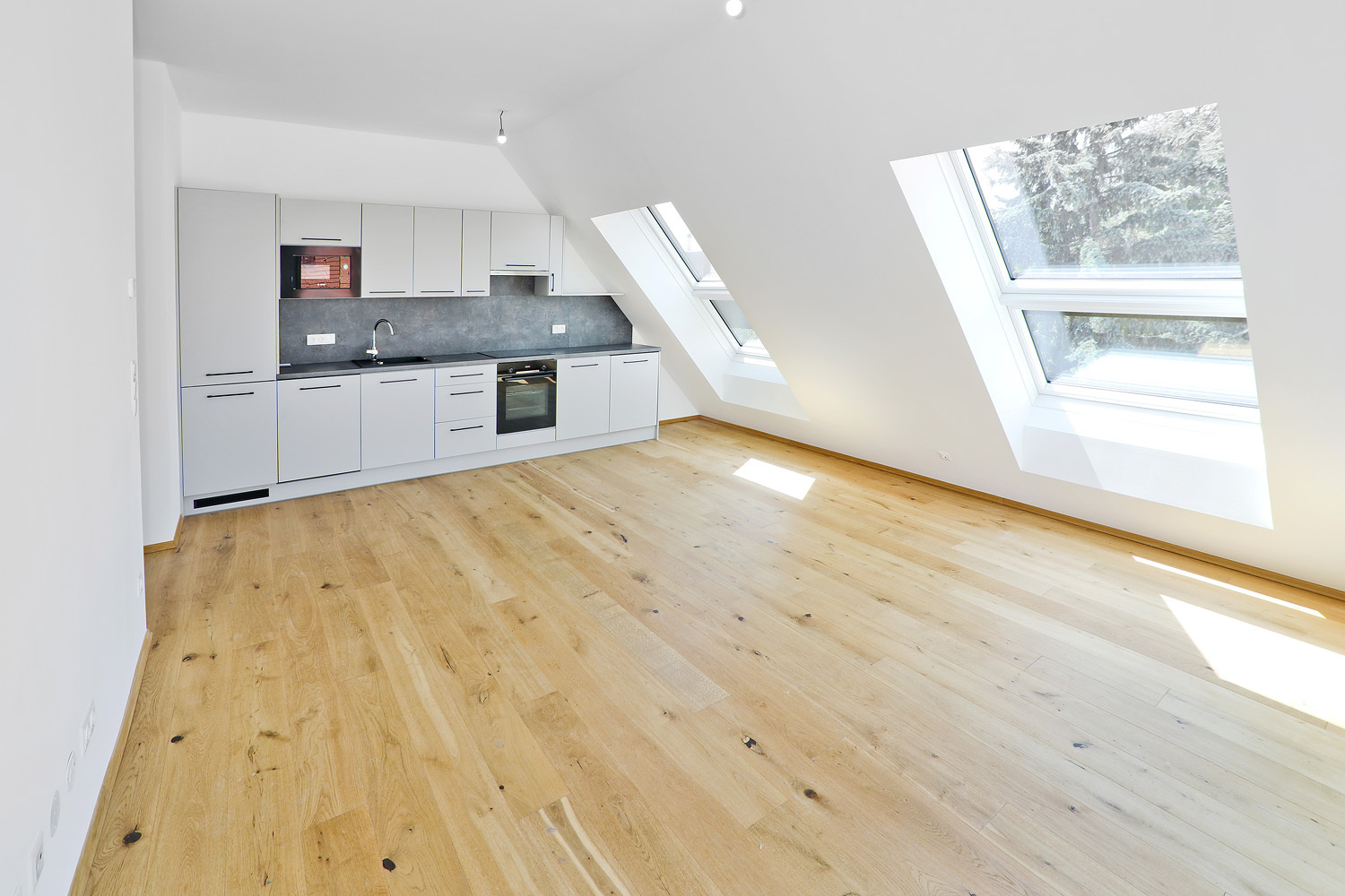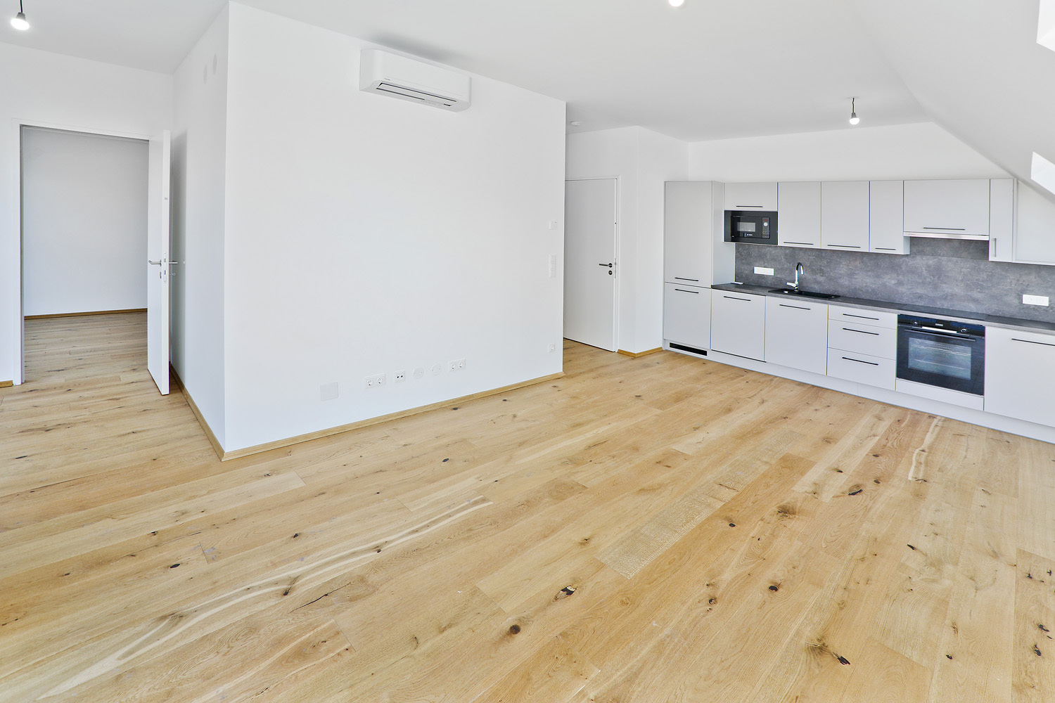 Die Wohnungen bieten unterschiedliche Grundrisse und Wohnflächen und eignen sich so sowohl für Singles und Paare als auch für Familien. Besonderer Wert wurde auf Funktionalität und modernes Design gelegt: Eichenparkettböden von Weitzer, Fliesen von xclusiva ceramica in den Nassräumen, hochwertige Fenster von IBM Schober sowie Türen von DANA fügen sich zu einem stimmigen Gesamtbild. Ergänzt wird die Ausstattung durch Fußbodenheizung, dreifach verglaste Fenster und – in den Dachgeschoßen – Sonnenschutz und Klimavorbereitung.