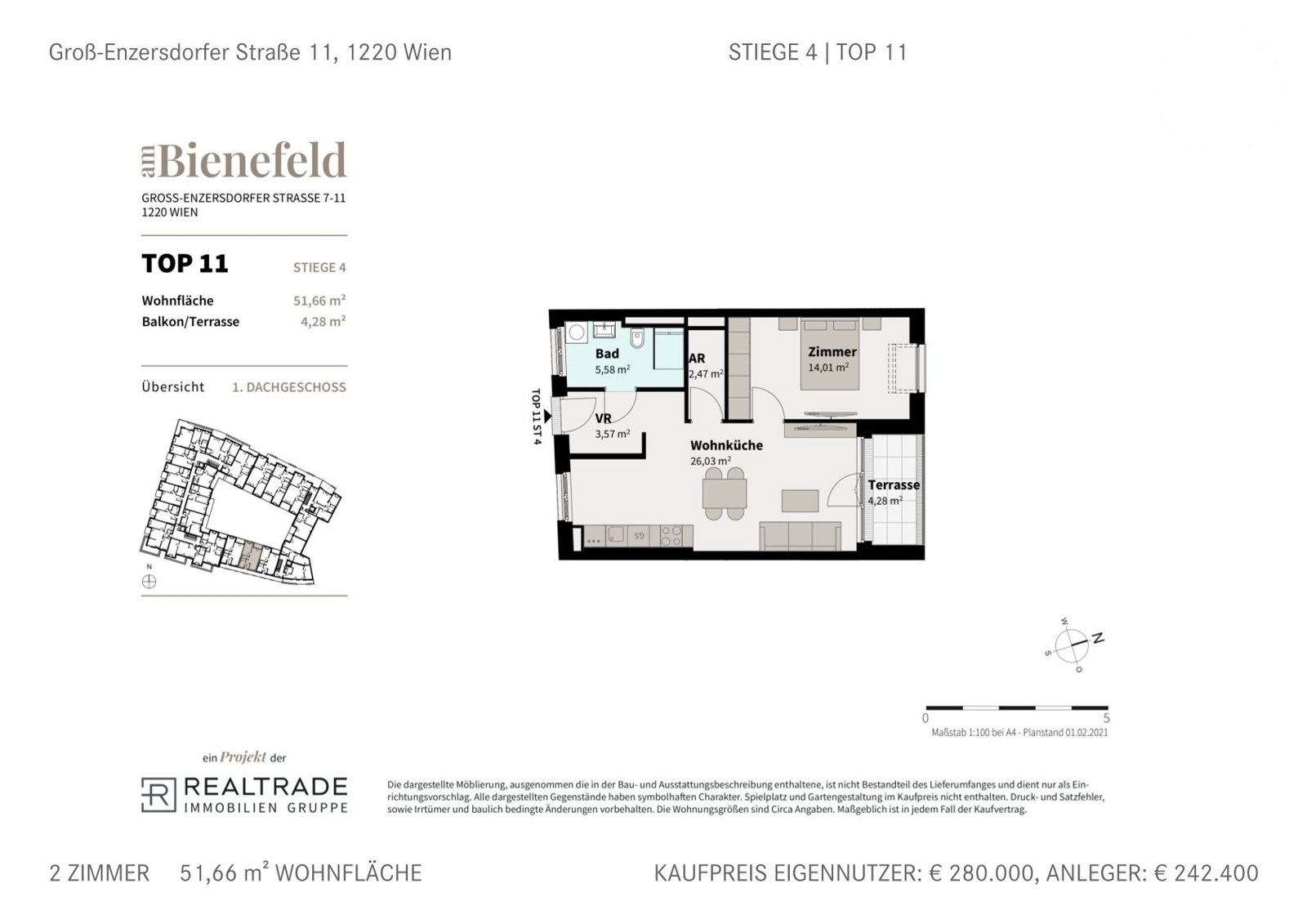 Willkommen am Bienefeld – in der Groß-Enzersdorfer Straße 7–11 im 22. Wiener Gemeindebezirk entsteht eine moderne Wohnhausanlage mit 83 bereits bezugsfertigen Eigentumswohnungen. Jede Einheit überzeugt durch großzügige Freiflächen wie Balkone, Terrassen oder Eigengärten, die zum Verweilen im Freien einladen. Die klar strukturierte, zeitlose Architektur fügt sich harmonisch in die Umgebung ein und vermittelt gemeinsam mit der Auswahl hochwertiger, natürlicher Materialien ein Gefühl von Ruhe und Geborgenheit.